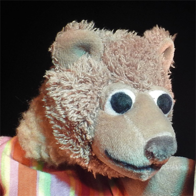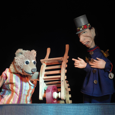 Handpuppen- und Menschentheater über einen neugierigen Bären